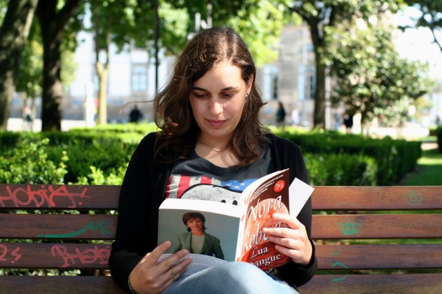 A Ana é uma leitora assídua e passa as horas de almoço na companhia de livros. Encontrei-a no jardim da Cordoaria a ler “Lua de Sangue“, um romance de Nora Roberts. Na semana anterior, tinha lido “Porto de Abrigo“, um outro livro da mesma autora e contou-me que em casa tinha um terceiro livro de Nora à sua espera. Estes romances tinham sido oferecidos à instituição para crianças onde a mãe da Ana trabalha e, por não se adequarem aos mais novos, tinham o lixo como destino. Convencida de que a filha os apreciaria, resgatou-os a tempo e foi assim que a Ana pôde descobrir uma autora de quem nunca ouvira falar e que a surpreendeu muitíssimo. Uma história com final feliz que se encaixa perfeitamente no espírito do Acordo Fotográfico!
