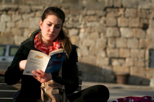 Descemos a Rua da Alfândega em direção ao Cais Estiva, na Ribeira do Porto, e foi o meu pai que me chamou a atenção para a menina que lia, sentada num banco, de frente para o Douro. “É estrangeira”, disse eu, e estava convencida disso até que a contornei, me aproximei de frente e verifiquei que o livro que lia era português. Quando começámos a conversar, a leitora que eu teimava em achar estrangeira revelou falar português com um sotaque especial, que tinha um travo a Brasil e a algo mais. Vim a descobrir que a Iris é alemã e aprendeu a falar português em Salvador da Baía, onde teve a oportunidade de participar num intercâmbio. Disse-me que aprendeu assim e que não quer de forma nenhuma perder o sotaque. Mais recentemente, veio para Portugal trabalhar como au pair e depois empregou-se num restaurante. Mas a estadia entre nós está quase a chegar ao fim: a Iris regressa a casa ainda este mês. Hoje, aproveitou a maravilhosa tarde de sol para ler ao ar livre na ribeira, onde os edifícios antigos lhe fazem lembrar o Pelourinho, em Salvador. O livro era uma edição antiga de “A Lua de Joana“, que comprou numa feira porque estava sem nada para ler.