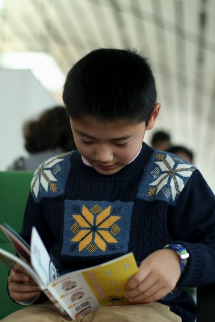 Na sala de embarque, algumas filas à minha frente, senta-se uma família: o pai, a mãe, o filho. No país onde os miúdos parecem nascer acoplados a todo o tipo de telemóveis, tablets e consolas, este filho traz antes um livro que abre e começa a ler. Comento com a N.: “Seria o primeiro pequeno leitor fotografado na China.” E lá fui eu. Dirijo-me aos pais para constatar que não dominam o inglês. Repito-me uma e outra vez (in english!), sempre sorridente, para mostrar que venho por bem. Acabo por me fazer entender e é-me concedida a fotografia. Antes, entrego o marcador e posso ver que o livro em causa é de banda desenhada, a primeira BD do Acordo Fotográfico. Acho que o Rou Yan Tong ficou muito bem na fotografia. Terei eu ficado bem nos retratos que o pai me fez enquanto eu lhe retratava o filho? Vou ver se me enviam as fotos da China.