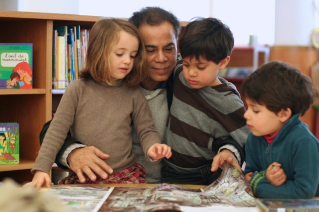 A cena era ternurenta. O Abel lia um livro de grande formato e alternava a voz do narrador com a voz da protagonista da história, representando com grande empenho e convicção o papel de Bruxa Mimi, que andava às voltas com o seu novo computador mágico. A Eva, o Noam e o Adam, por seu turno, disputavam o colo do Abel num esforço para estar o mais possível em cima do livro e não perder pitada da história. O entusiasmo era de tal ordem que a minha interrupção, embora breve, gerou algum descontentamento. O Adam interrompe a minha conversa com o Abel e, forçando o pai a virar o rosto para o livro, diz: “Vá láááá!”. É que não havia tempo a perder: uma vez terminada a história, os quatro iam para a sala de audiovisuais da Biblioteca Municipal Almeida Garrett ver o filme “O Pedro e o Lobo“.