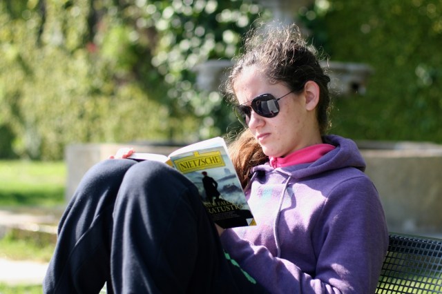 Num dos socalcos do jardim do Palácio de Cristal de onde se tem uma vista magnífica sobre o Douro, encontrei a Carla, uma jovem universitária brasileira que veio estudar para o Porto. Lia “Assim Falou Zaratustra“, de Friedrich Nietzsche, para fazer uma pausa no estudo de álgebra linear. Disse-me a Carla que o estudo a obriga a ficar muito presa aos livros de matemática e que por vezes precisa de um escape, nem que seja apenas por meia hora. É nessas ocasiões que procura textos filosóficos, que aprecia especialmente e que lhe permitem abrir a mente.