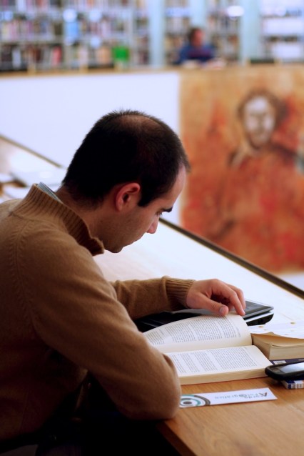 Sob a vigilância atenta de Almeida Garrett, que se vê pintado em pano de fundo, o Carlos consultava “O Toque Clássico – A Arte de Liderar de Homero a Hemingway”. No curso que frequenta, e no âmbito de uma disciplina sobre gestão de pessoas, o Carlos foi desafiado a fazer um trabalho sobre um líder conhecido. A sua escolha recaiu sobre Steve Jobs, mas antes de avançar para a redação desse trabalho decidiu ler um pouco mais sobre teoria da liderança. Era a primeira vez que ia à Biblioteca Municipal Almeida Garrett. O momento ficou registado.