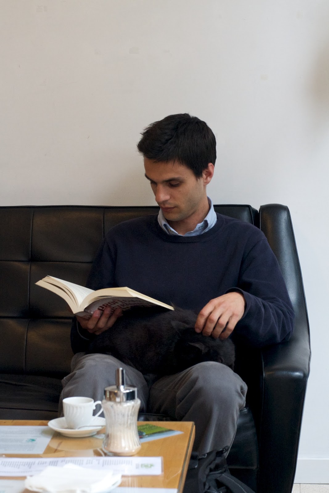 Por questões profissionais, o Isamel é sobretudo leitor habitual de livros técnicos. Já à hora de almoço, para passar o tempo, procura livros de leitura fácil que lhe proporcionem um bom momento de entretenimento, tarefa que “As Profecias de Nostradamus“, um livro que considerou do género dos de Dan Brown, parecia cumprir na perfeição. Fotografei-o no Quintal com a a gata Mizuna ao colo, a anfitriã mais simpática e mais mimalha que alguma vez conheci: recebe-nos com um miado doce mal abrimos a porta da loja e salta-nos para o regaço assim que nos sentamos num dos sofás.