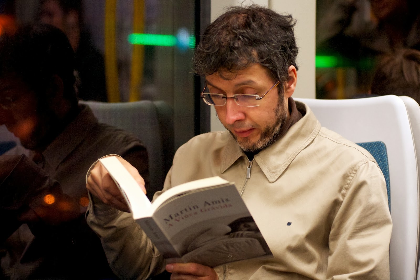 À semelhança de muitos outros passageiros que tenho fotografado, o Maurício aproveita as viagens de metro para ler porque, infelizmente, não tem muito tempo disponível para fazê-lo. “É um bocado triste, mas é verdade”, lamenta. Fotografei-o a ler “A Viúva Grávida“, um romance do britânico Matin Amis que lhe foi oferecido. Deste mesmo autor, recordou que já tinha lido também “Dinheiro“, mas na versão inglesa porque considera muito fracas a maioria das traduções para português. Maurício salientou, no entanto, que Martin Amis não é um autor que aprecie por aí além. A sua preferência vai, de longe, para Paul Auster e Douglas Copland.