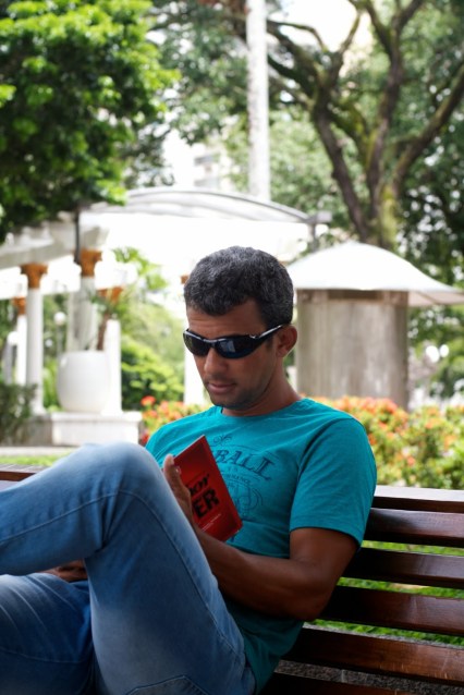 Enquanto estive em Salvador da Bahia apanhava todas as manhãs um autocarro que me levava de Itaigara, onde estava alojada, para o Campo Grande, uma praça monumental próxima ao Pelourinho, o coração histórico da cidade. Esta praça fica no roteiro dos festejos de Carnaval e nos primeiros dias da minha estadia em Salvador ainda estavam a ser desmontadas as arquibancadas onde se sentaram milhares de baianos para ver passar os trios eléctricos e a multidão que os segue ao longo de 25 quilómetros de folia. O enorme estaleiro em que esta zona da cidade estava transformado escondia a beleza do jardim e dissuadia qualquer um de querer lá entrar, mas ao fim de algum tempo as bancadas desapareceram, o ruído dos trabalhos diminuiu e eu lá me decidi a revisitar este espaço. Em boa hora o fiz porque logo à entrada dei de caras com o Gilbevan que tinha acabado de comprar no quiosque da praça o livro “O Melhor da Super: 1987 – 2012“, uma edição comemorativa da revista “Super Interessante” que reúne as melhores reportagens dos últimos 25 anos. “A minha irmã é assinante da Super Interessante e eu lia todas as edições quando era menino. Não me identifico muito com romance. Prefiro livros científicos”, explicou. Assim o deixei, agarrado ao seu livro novinho em folha, para ir ver mais de perto o monumento aos heróis das batalhas da independência da Bahia, que se ergue no centro do Campo Grande.