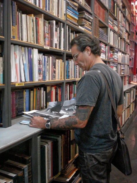 No primeiro dia em que fui o centro do Rio de Janeiro tinha a Livraria da Travessa, na Rua Sete de Setembro, como referência. Foi por aí que comecei o meu passeio. Depois fui almoçar à Confeitaria Colombo de onde segui para a Catedral de São Sebastião e, posteriormente, para o Palácio Gustavo Capanema. Entre cada local fui caminhando devagar pelas avenidas da cidade, cheias de gente, cheias de carros, cheias de ónibus barulhentos. Parei nalgumas montras, apreciei edifícios, deambulei por entre os camelôs, observei o jeito de quem passava. E quando já o sol se punha e estava na hora de pensar no regresso à Gávea, onde estava alojada, decidi ir localizar o Real Gabinete Português de Leitura, que tencionava visitar no dia seguinte. Foi nesse trajecto pela Rua Luís de Camões que passei em frente à Letra Viva, uma livraria que é também alfarrabista (ou sebo, no português do Brasil) e onde funciona o Café Olé. De fora o espaço amplo pareceu-me muito bonito e depois de entrar descobri-lhe os toques extravagantes conferidos pelo mobiliário antigo, loiças, porcelanas e todo o género de quinquilharia inusitada. Foi nesta livraria fora do comum que conheci o Carlos, que folheava um álbum de fotografias. Vim a saber depois que o livro, com o título “The Early Stones 1963-1973“, recolhia imagens capturadas nos primeiros anos da carreira da banda de Mick Jagger e que o Carlos procurava nesses registos inspiração para o seu trabalho. “Concebo padrões para estamparia e desenvolvo colecções. Neste momento estou a trabalhar numa colecção baseada no rock dos anos 50 e 60. Esta deve ser a quarta livraria em que entro hoje, olhando tudo”, explicou-me.