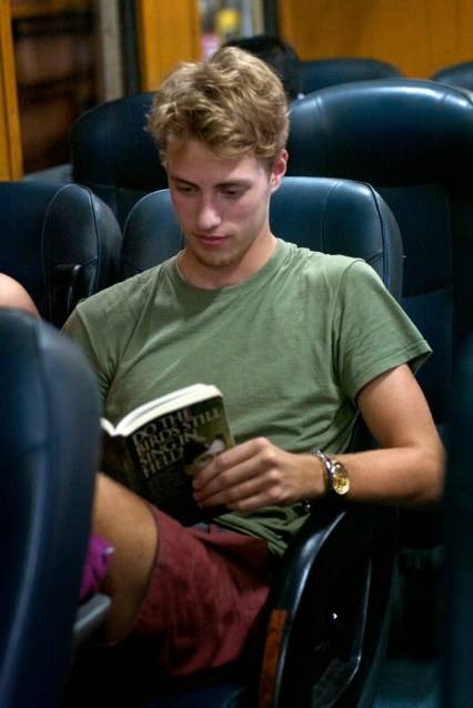 Dos cinco dias que estive em Banguecoque, dois foram passados no quarto do hotel. Nunca saberei ao certo o que aconteceu ao meu estômago. Talvez tenha tido uma intolerância momentânea à profilaxia da Malária ou talvez tenha comido alguma coisa que não digeri bem. Só sei que essa má disposição e o quase jejum a que me forcei durante 48 horas consumiram boa parte das minhas forças e que as temperaturas a rondar os 45 graus centígrados de sensação térmica acentuaram ainda mais o meu cansaço. Perante este cenário, carregar as mochilas — uma grande com cerca de 15 quilos e outra mais pequena com 8 quilos — até à carruagem do comboio noturno que me levou para Chiang Mai, no norte da Tailândia, representou um esforço titânico. Quando por fim me deixei cair no lugar que me coube, tinha a roupa colada ao corpo, escorria suor e arfava. Eram dez da noite, todas as janelas da velhíssima carruagem estavam escancaradas e todas as ventoinhas pregadas ao teto giravam furiosamente. Ainda assim, parecia não haver ar suficiente para se respirar. Só queria que o comboio partisse e que a sua marcha lenta me embalasse até ao sono profundo. Teria 13 horas para dormir. Quando por fim a máquina se pôs em movimento, produzindo um som metálico semelhante ao que ouvi no cinema quando o Titanic se afunda, ocorreu-me percorrer toda a carruagem com o olhar e ao virar-me para trás vi que um dos rapazes ingleses que tinha embarcado depois de mim estava a ler. Apesar das pernas trémulas e do meu muito mau aspeto, lá fui ter com ele e fiz a fotografia, enquanto os seus companheiros de viagem, gozões, me juravam que ele não sabia ler. “Está a fazer de conta! Ele só sabe ler os livros do “Onde está o Wally!“, diziam por entre gargalhadas. Mas o Joe não desarmou e manteve a pose. “Não sou leitor habitual“, disse-me depois, “mas estou a aproveitar a viagem pela Ásia para ler um pouco. Acabei o único livro que trouxe, por isso pedi este emprestado a um dos amigos que veio comigo“. O livro em causa era “Do The Birds Still Sing in Hell?“, um relato verídico escrito na primeira pessoa por Horace Greasley, um soldado britânico feito prisioneiro pelos alemães no decorrer da Segunda Guerra Mundial e que durante o seu cativeiro viveu uma intensa história de amor com a alemã que lhe servia de intérprete. Depois da nossa conversa, voltei ao meu lugar e adormeci de imediato. Na amanhã seguinte, já o sol ia alto, voltei a olhar para trás. O Joe e todos os seus camaradas de viagem estavam a ler.
