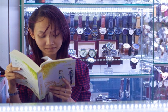 Num desses dias, já ao cair da tarde, entrei no Saigon Square, uma galeria de rés-do-chão e primeiro andar a abarrotar de pequenos stands onde se vende roupa, calçado e outros acessórios que parecem ter sido desviados das fábricas que produzem para as marcas globais. Da Zara à GAP, da Adidas à Nike, este é o lugar para investir em pechinchas, sejam elas genuínas ou forjadas. Logo à entrada, num expositor de relógios, encontrei uma vendedora que, à falta de clientes, se ocupara com um livro. Ty Ty, nascida e criada em Saigão, diz trabalhar todo o dia no stand e ocupar as horas vagas a ler. De sorriso contido, explica-me que gosta sobretudo de romances e que lê três a quatro por mês. Naquele dia de fim de maio tinha começado “Chỉ được yêu mình anh” (qualquer coisa como “Só tu me amas”), da autora chinesa Nam Lăng, comprado precisamente na livraria onde umas horas antes não me permitiram fotografar. Na altura, valeu-me o telemóvel. Se quiserem espreitar o lugar onde a Ty Ty comprou o seu romance, basta que acedam aqui para ver as duas fotos que tirei à socapa.
