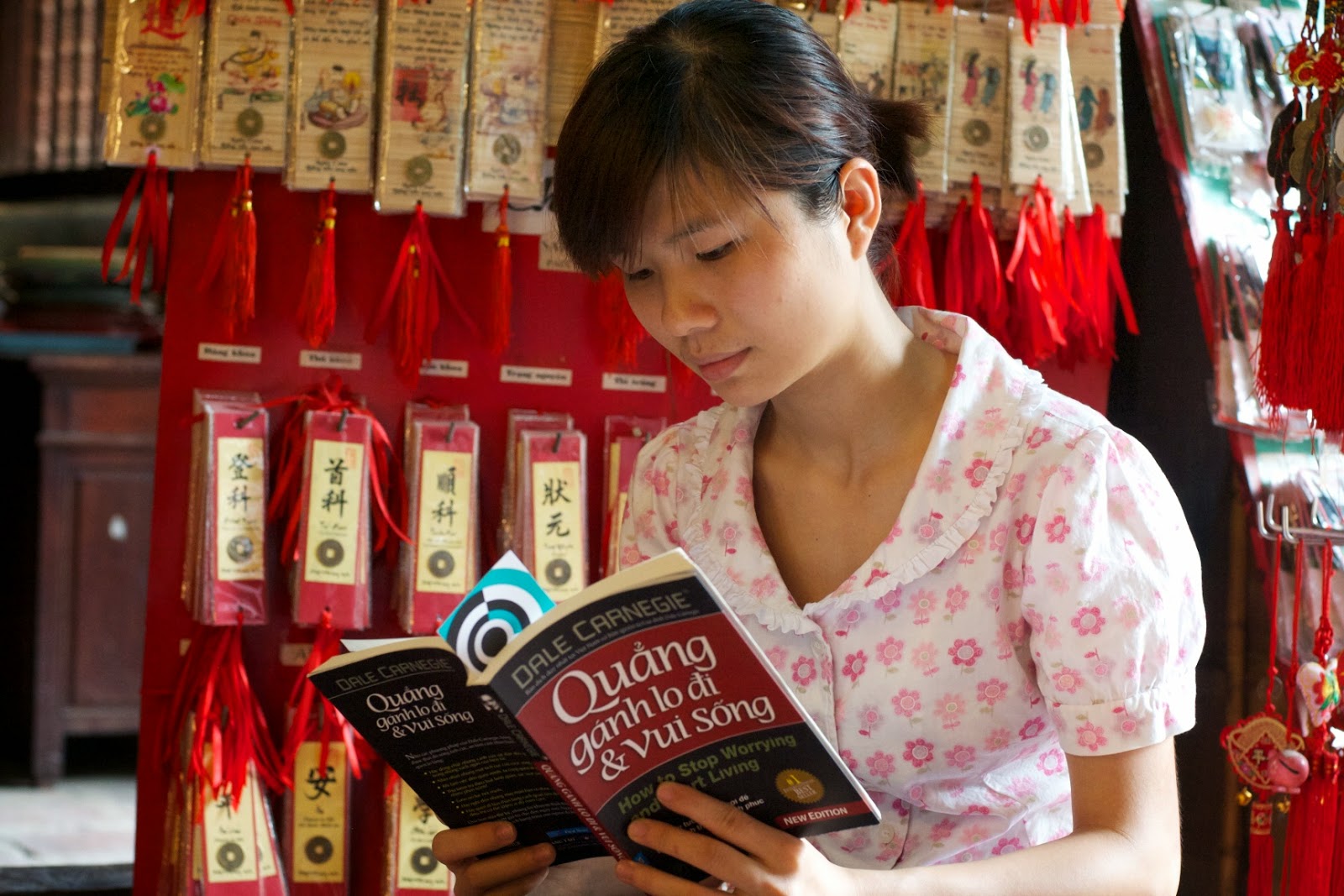 Naturalmente, ao longo da visita pensei muitas vezes no quanto seria perfeito encontrar um leitor no magnífico Templo da Literatura. E, sortuda como tenho sido, foi o que acabou por acontecer, já mesmo na reta final, quando entrei na loja de souvenirs que existe na ala esquerda do edifício onde funcionava a universidade. Aí, aproveitando a calmaria daquele dia, a jovem Han lia a edição vietnamita de “Como Deixar de se Preocupar e Começar a Viver“, de Dale Carnegie. Leitora assídua, sobretudo de literatura infantil que diz ser a sua preferida, Han procurava orientação nas palavras do guru norte-americano da motivação. “Sou uma pessoa que se preocupa muito, por isso preciso de ajuda. Espero poder preocupar-me menos e passar a divertir-me mais“. E sabem com o que mais se preocupa a Han? Com o trabalho. Irónico é que estivesse a tentar travar esse processo no templo dedicado a Confúcio, o filósofo para quem o trabalho era uma das pedras basilares do seu pensamento.