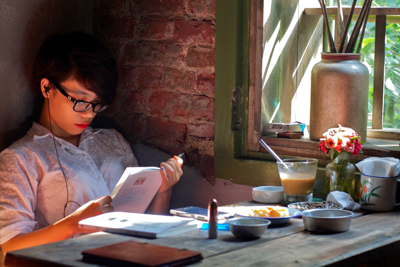 Os livros que Linh tinha consigo eram ambos de autoras vietnamitas. O que lia intitulava-se “Hoa Linh Lan“, de Gào, um bestseller que conta a história de um triângulo amoroso entre um vietnamita solitário e duas miúdas, uma delas chinesa. O outro livro, chamado “Người yêu cũ có người yêu mới” era escrito por Iris Cao. Tinha-lhe sido oferecido por um amigo que nutria por ela mais do que um sentimento de amizade. Depreendi, pela sua expressão, que o sentimento não era mútuo e tive mais tarde a certeza, quando Linh me falou do namorado que, curiosamente, frequenta aulas de português na Universidade de Hanoi. “Ainda não tive coragem de começar a lê-lo“, confidenciou-me. E eu achei triste saber de mais uma história de amor não correspondido. De resto, sobre os seus hábitos de leitura, Linh afirmou: “Gosto de estar sozinha neste café, a ler. Leio muito. Não gosto tanto de romances. Prefiro livros que me façam refletir. Quando leio, sinto que faço uma pausa e que tenho tempo para pensar. Os livros são como uma lente através dos quais se pode ver tudo. Quando estás confusa acerca de algo, lê e talvez encontres a solução“.