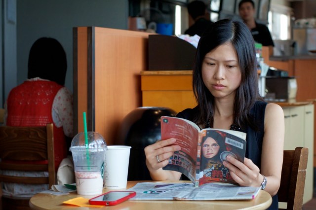 Nascida e criada em Hong Kong, Fion é professora primária e estava a preparar-se para começar a ensinar chinês. “Uns amigos que também são professores recomendaram que lesse este livro para me inteirar do que andam os miúdos a ler“, contou-me. “Fui buscá-lo à biblioteca da escola. É de um autor também natural de Hong Kong e pertence a uma série que tem como herói um agente especial. Neste livro, o protagonista parte numa missão anti-terrorista no médio oriente.” Disse-me a Fion que, na sua qualidade de professora, tenta ler o mais possível. Gosta particularmente de literatura infantil, que diz ser mais direta, fácil de entender e próxima do dia a dia. Mas não põe de parte os livros para os mais crescidos e aponta sem hesitações um autor de que gosta muito (e cujo nome entendi a muito custo): Paulo Coelho. Passei os minutos seguintes a ensiná-la a pronunciar corretamente o nome do autor, elucidando-a sobre a sua nacionalidade e a língua em que se expressa: o belíssimo português.