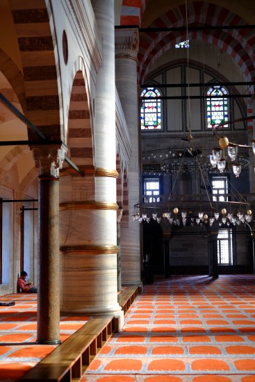 Também a partir da praça de Eminönü, segui um dia para a direita, ao início da tarde, e subi aquela que é designada por terceira colina de Istambul. O trajeto que escolhi implicou atravessar boa parte do bazar de rua de Eminönü, a abarrotar de mercadorias que atravancam o caminho já de si estreito para acomodar os milhares de clientes. Tudo se pode vender e comprar nestes locais fascinantes onde os sentidos — sobretudo o olfato e a audição —  são forçados a reajustar-se e a apurar-se. Posso passar horas a observar e a tentar captar o ambiente com a lente de uma câmara. Porém, o tamanho da riqueza torna o meu esforço inglório. Que possam os turcos nunca cair no erro de preferir shoppings insípidos. À medida que chego ao topo da colina, começam a revelar-se os minaretes e as cúpulas da Suleimania ou Mesquita de Solimão, o edifício mencionado na abertura do romance “A Senhora”. Transponho um arco e entro no recinto. O jardim fronteiro ao monumento, relvado e com árvores de copa ampla, é um extenso miradouro virado a norte. Tenho Istambul e o Bósforo de novo aos meus pés.