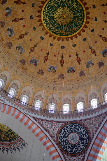 Não me embrenhei demasiado no Grande Bazar, que achei luminoso, organizado e asséptico, sem o charme penumbroso e caótico dos bazares iranianos. Em contrapartida, o Palácio Topkapi, residência de sultões e sede do Império Otomano por quatrocentos anos, arrebatou-me. A sua localização, na vertente norte da colina, proporciona vistas belíssimas sobre o Bósforo e Istambul. Mas mais do que o sítio onde se encontra e a arquitetura das múltiplas estruturas que se espraiam pela vasta área que ocupa, foi a sumptuosa decoração dos seus interiores que me deixou horas de boca aberta: há uma explosão de cores e padrões impressos em azulejos que cobrem tudo — paredes, tetos, cúpulas —, combinados de forma sábia e harmoniosa com candelabros e espelhos de grandes dimensões, madeiras trabalhadas com madrepérola, vitrais de cores quentes, otomanas de brocados vermelhos e apontamentos de talha dourada um pouco por toda a parte. Só um elevado grau de sofisticação e apurado sentido estético permite tanto arrojo sem cair no mau gosto. Também me demorei na Mesquita Azul, claro, mas a grande experiência espiritual foi vivida na Ayasofya, um edifício com mil e quinhentos anos de história, de dimensões colossais, famoso pela sua cúpula, onde a iconografia católica bizantina expressa em mosaicos delicados coexiste pacificamente com símbolos islâmicos umas centenas de anos mais recentes. Emocionaram-me o espírito ecuménico, a elegância, a sobriedade e a energia límpida que o monumento emana.