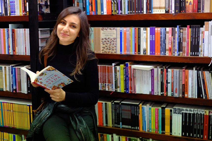 Gülçağ é leitora frequente e ultimamente, por causa do seu doutoramento, tem dedicado mais tempo aos livros de arte. A tese que redige explora a forma como as divisões das casas são representadas nas mais variadas formas de expressão artística: no cinema, no teatro, na pintura, etc. A Livraria Mephisto é um lugar que visita muitas vezes, gosta do ambiente e da música sempre boa que anima o espaço. Gülçağ tinha acabado de comprar um título sobre Ayurveda, uma forma de medicina tradicional com raízes na Índia, mas os seus interesses literários, disse-me, abrangem temas tão diversificados como a filosofia, a mitologia ou os títulos de desenvolvimento pessoal.